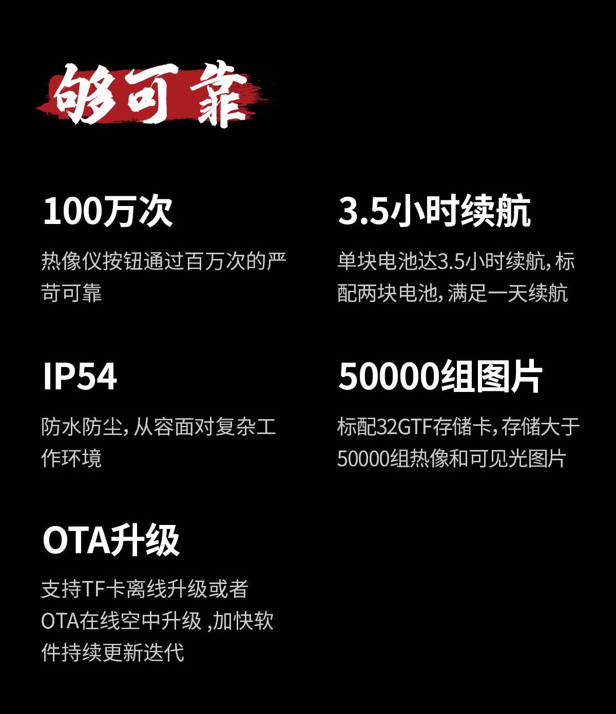 智能手持热像仪FOTRIC322Q 红外分辨率 160*120 热灵敏度(NETD) 50mk(0.05°C) 视场角(FOV) 46.5° x35° *小成像距离 0.1 m 对焦 手动对焦和 1m自动对焦 收藏标注 有,对于感兴趣的热像图标可以添加收藏标注,并且在热像仪的图库中可快速查找到标注过和图片 探测器类型 非制冷型红外焦平面探测器 像元间距 17μm 激光指示器 等级:2级;波长:635nm;功率:<1mW 智能手持热像仪FOTRIC322Q测温分析 测温范围 -20 °C ~ 550°C 测温精度 ±2 °C 或 2% 取大值(在 25 °C 环境温度) 发射率校正 支持,自定义输入和材料表选择,范围 0~1 支持语言 中文、英文 图像显示 超像素(SR) 增强至 320*240 画中画 有 显示屏 3.5寸触摸屏 颜色报警 支持,温度之上、温度之下和温度之间 视频及功能 分析软件 AnalyzIR热像分析软件 数据存储 无线连接 WiFi/便携式热点,蓝牙 视频录制 支持全辐射视频和MP4视频录制,全辐射录制包含原始温度数据,录制的视频文件可本机和PC软件进行测温分析和处理 文件格式 JPEG(全辐射热像图)、可见光图片、IRS(全辐射视频)和MP4(非全辐射视频) 语音注释 支持,可录制*长200秒语音 文本注释 支持,无长度限制的文件注释 远程显示查看 通过Type-C3.0接口连接PC软件(FOTRIC AnalyzIR)查看热像视频流 通过HDMI高清接口连接到显示屏或投影仪 远程控制操作 通过连接PC软件(FOTRIC AnalyzIR)进行远程操作控制 电源系统 工作温度 -20°C 至 50°C 相对湿度 <95%RH 智能手持热像仪FOTRIC322Q通用指标 空间分辨率(IFOV) 5.15 mrad 焦距 f3.3 Pdm云热像 不支持 HawkAI功能 支持 AI体温筛查 支持 MagicThermalTM 细节增强成像技术 开启MagicThermal,能够在实时热像画面中,通过触控的方式呈现目标区域的彩色热成像,其他区域则以黑白热成像显示 FTP快传 通过WiFi/便携式热点连接热像仪,通过FTP访问热像仪内数据 蜂窝数据(4G) 支持 T-DEFTM 可见光测温,可调节热像透明度0%-100% IREdgeTM 有 TWBTM 有 可见光相机 800万像素,工业级数码相机 LED灯 支持手电筒照明和闪光灯模式 帧频 30Hz 测温量程 -20 °C ~ 120°C, 0 °C ~ 550°C 智能量程 支持 环境温度校正 支持 反射温度校正 支持 相对湿度校正 支持 测温距离校正 支持 红外窗口校正 支持,支持根据红外窗口温度和透过率校正测温 测温区域 点:8 线:1 区域:4 温升功能 支持 区域报警 支持 区域发射率校正 支持 图像模式 热像、可见光、画中画和T-DEFTM 通用调色板 8 灰白(Grey)、铁红(Iron)、彩虹(Rainbow)、灰红(GreyRed)、春雨(Rain)、炽热(GlowBow)、医学(Medical)、棱镜(Prism) 调色板反转 支持将通用调色反转显示图像 自动温宽模式 自动调整热像画面的水平和跨度 手动温宽模式 手动调节热像图的水平和跨度 支持滚轮快速调节/*大*小值温度调节/温宽跨度调节 触控温宽模式 根据手指触控快速调节热像图的水平和跨度, 支持触控选择热像图温宽的*大值和*小值 *小温宽 自动:3°C ,手动:2°C 存储卡 TF卡,标配32GB,可存储约10万张图像;可适配64GB、128GB TF卡 图像捕捉 支持单帧拍摄和定时拍摄 本机图库 有 本机文件分析 支持 冻结画面 有,支持单帧拍摄和全辐射视频录制 标签 支持,可对拍摄图像文件设置标签用于分类管理文件 扫一扫 支持,可扫描二维码和条形码,作为标签 电池 3.6V,5000mAh锂电池,可现场更换、可充电 工作时间 ≥5小时 充电时间 3.5小时充满 充电系统 支持独立电池充电器和通过热像仪Type-C连接适配器或电脑充电 外部供电工作 支持使用Type-C连接电脑或电源适配器(5V,3A)给热像仪供电 节能 自动息屏 探测器响应波段 ~7-14μm 数字变倍 1-6倍,支持滚轮连续可调 WiFi连接 支持2.4GHz与5GH频段,支持802.11a/b/g/n/ac 蓝牙连接 BT4.2 LE,可连接至蓝牙耳机 USB接口 USB Type-C类型;符合USB 3.0/2.0规范,支持USB OTG HDMI接口 Micro HDMI类型,符合HDMI 1.4规范,支持以60Hz传输1080P图像视频 外部存储接口 TF卡,支持热插拔识别 存放温度 -40°C 至 70°C, 不带电池 便携软包 标配 硬质便携箱 选配 安全标准 SELV(安全特低压电路)(GB 4943.1-2011/IEC60950-1:2005) 电磁兼容性 静电放电 振动 2g(GB/T 2423.10-2008/IEC 60068-2-6:1995) 冲击 25g(GB/T 2423.5-2019/IEC 60068-2-27:2008) 碰撞 带包装箱 10g(GB/T 2423.6-1995/IEC 60068-2-29:1987) 跌落 设计为2m抗跌落 尺寸(高*宽*长) 243*95*142 重量(含电池) 730g 防护等级 IP54 三脚架安装 UNC 1/4 -20接口可直接连接三脚架 外壳材质 硬胶:PC+ABS,软胶:TPE 保修期 整机2年 建议的校准周期 2年 符合RoHS指令 符合 -
